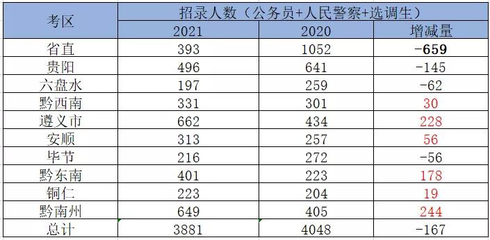 去年招錄人數(shù)增長最多的前三個(gè)地市分別為黔南州、遵義市、黔東南。招錄人數(shù)縮減最多的是省直,縮減了659人。