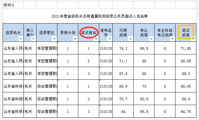 最后,看面試公告,查完成績當天各地會陸續(xù)發(fā)布面試公告,公告附件中會有面試名單,名單中就有你的筆試成績及筆試排名,如下: