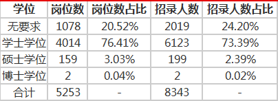 3、學(xué)位:大部分崗位對于學(xué)位有要求,無學(xué)位要求的崗位占比僅20.52%;