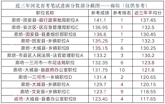 2020 年河北公務(wù)員考試?yán)确坏貐^(qū)招錄144個崗位,招錄人數(shù)285人,最低進(jìn)面分?jǐn)?shù)線104.15,最高進(jìn)面分?jǐn)?shù)147.25,平均進(jìn)面分?jǐn)?shù)線為 113.77。由平均分來看,廊坊市政府部門 130、各鄉(xiāng)鎮(zhèn)集中在 127、法檢系統(tǒng)集中在 125。
