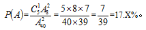 方法二:定位法。既然小張、小李隨機入座,不妨先讓小張選定一個座位,再讓小李選。小張先選一個座位的概率為40/40=1,小張選好后,小李只能在剩余的39個座位中隨機選,且要想和小張在同一排,小李只能在小張選定的那一排剩余的7個位置中任選,概率為7/39,則滿足小張、小李在同一排的概率=1×7/39=17.X%。故答案為B。