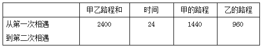 在這一過程中我們用圈2來表示甲乙第二次相遇的點,我們來觀察第二張行程圖,發(fā)現(xiàn)此時甲乙兩人走過的路程和變成了兩段的AB段路程,也就是2400米,變?yōu)榱嗽瓉淼膬杀丁D敲次覀兛梢缘玫絻扇怂脮r間為2400÷(60+40)=24分鐘,進而可以得到甲和乙所走過的路程分別為24×60=1440米和24×40=960米。