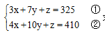 例題3:甲、乙、丙三種貨物,若購買甲3件,乙7件,丙1件,共需325元;若購買甲4件,乙10件,丙1件,共需410元。那么購甲、乙、丙各1件,共需多少元( )?