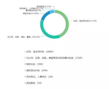 最多的一級(jí)案由為合同、準(zhǔn)合同糾紛,其下最多的案由為委托理財(cái)合同糾紛;第二類是與公司、證券、保險(xiǎn)、票據(jù)等有關(guān)的民事糾紛類;第三類為物權(quán)糾紛,其下案由全部為財(cái)產(chǎn)損害賠償糾紛,其本質(zhì)上屬侵權(quán)責(zé)任糾紛;此外還有20%左右的案件直接納入侵權(quán)責(zé)任糾紛。