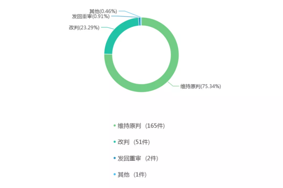通過對(duì)二審裁判結(jié)果的可視化分析可以看出,當(dāng)前條件下維持原判的為165件,占比為75.34%;改判的為51件,占比為23.29%;發(fā)回重審的為2件,占比為0.91%。