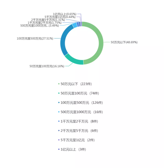 標(biāo)的額為50萬(wàn)元以下的案件數(shù)量最多,為223件,占案件總量的48.69%,接近于一半。100萬(wàn)元至500萬(wàn)元的案件為126件,占案件總量的27.51%,50萬(wàn)元至100萬(wàn)元的案件為74件,500萬(wàn)元至1000萬(wàn)元的案件為16件,1千萬(wàn)元至2千萬(wàn)元的案件為8件。