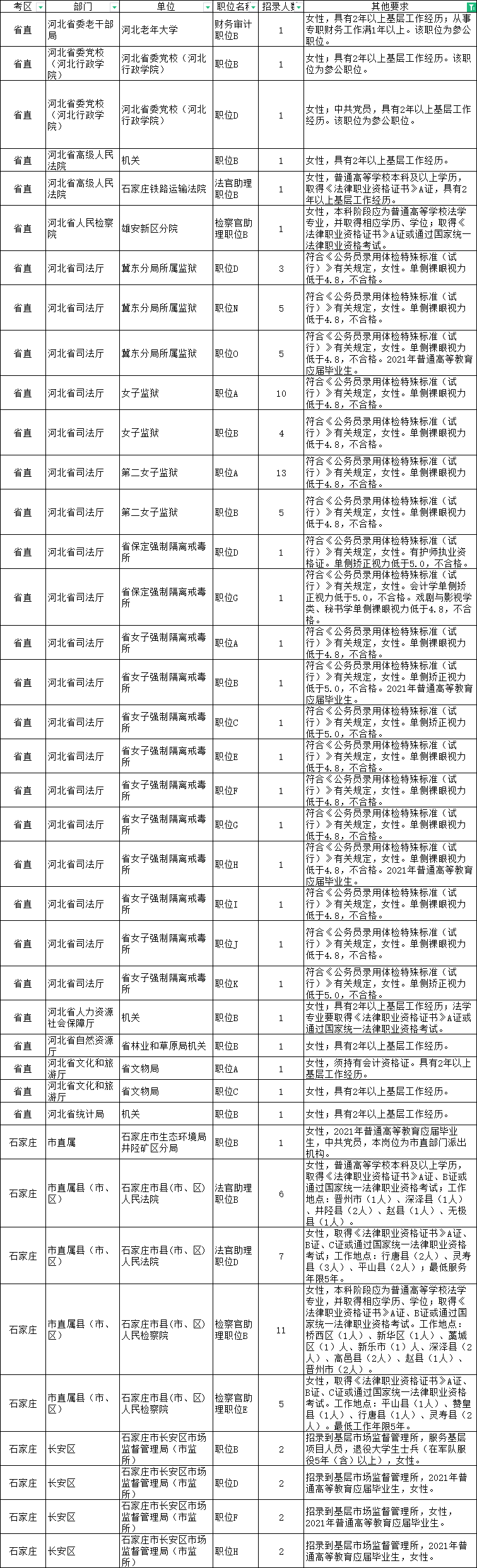 河北省考中,只限女性報(bào)考的崗位有河北省委黨校、河北司法廳女子監(jiān)獄、河北司法廳女子戒毒所、河北省人民法院法官助理、河北省人民檢察院檢察官助理等等。以下為2021年河北省考只限女性報(bào)考的部分崗位。