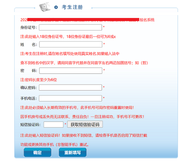未注冊考生請注冊后再登錄,點(diǎn)擊圖1-4中的‘注冊新用戶’進(jìn)入注冊頁面如圖1-5,請考生按提示填寫注冊信息。點(diǎn)擊‘確定’提交注冊信息,注冊成功后將返回圖1-4頁面進(jìn)行登錄(返回登陸時(shí)自動(dòng)把身份證號(hào)填充到身份證號(hào)文本框內(nèi))。