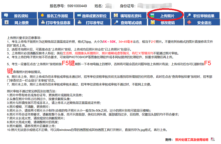 1、點(diǎn)擊‘照片上傳’進(jìn)入照片上傳界面,上傳照片前請?jiān)敿?xì)閱讀‘上傳照片要求及注意事項(xiàng)’如圖4-1。