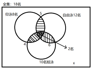 【例題3】18名游泳運(yùn)動(dòng)員中,有8名參加仰泳,有10名參加蛙泳,有12名參加自由泳,有4名既參加仰泳又參加蛙泳,有6名既參加蛙泳又參加自由泳,又5名既參加仰泳又參加自由泳,有2名這三個(gè)項(xiàng)目都參加。三個(gè)項(xiàng)目都沒(méi)有參加的有多少名?( )