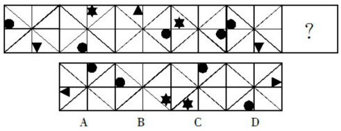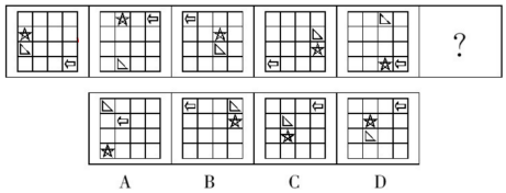 【答案】C【解析】這道題目整個(gè)出題方式屬于順推型,按照前幾幅圖的分布規(guī)律,猜測最后一幅圖的變化情況。具體圖形來看,基本圍繞三類元素的變化,分別為箭頭,五角星,三角形,不難發(fā)現(xiàn),在數(shù)量不變的情況下,三個(gè)圖形的相對(duì)位置發(fā)生改變,箭頭逆時(shí)針移動(dòng)3格,五角星和三角形斜向?qū)且苿?dòng)1格得到下一個(gè)圖形,故本題選C。