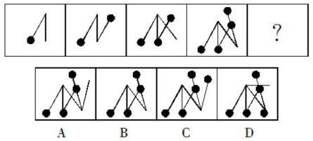 仔細(xì)觀察,前一個(gè)圖形中一條直線的端點(diǎn)處既沒有黑點(diǎn),也不與其他直線相接,則在該端點(diǎn)增加1條直線和黑點(diǎn),黑點(diǎn)位于增加直線的末端得到后一個(gè)圖形;前一個(gè)圖形中一條直線的兩端均沒有黑點(diǎn),則在一端添加1條直線,另一端添加1個(gè)黑點(diǎn)得到后一個(gè)圖形。故本題選D。