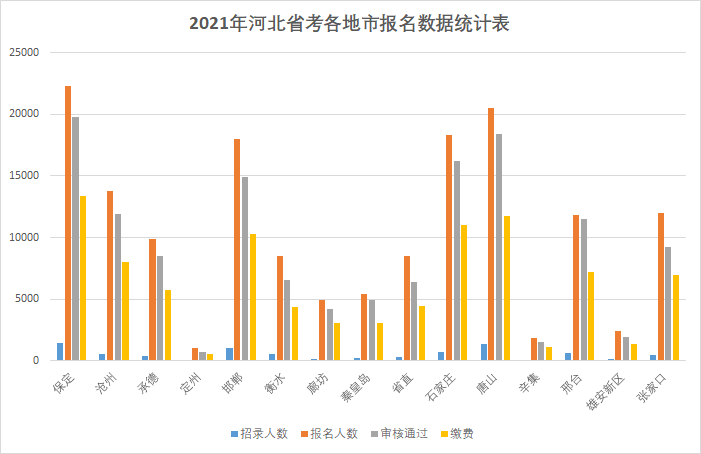 石家莊為歷年審核通過、繳費人數(shù)最多的地市;保定、唐山、邯鄲報名審核通過人數(shù)和繳費人數(shù)也較多。