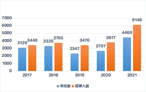 近五年省考招錄人數(shù)整體呈上升趨勢(shì),2021年云南省考公告招錄人數(shù)與2020年相比,由3817人增加至6146人,擴(kuò)招61%,如果今年仍然有擴(kuò)招趨勢(shì),無(wú)疑增加了廣大考生的錄取幾率。