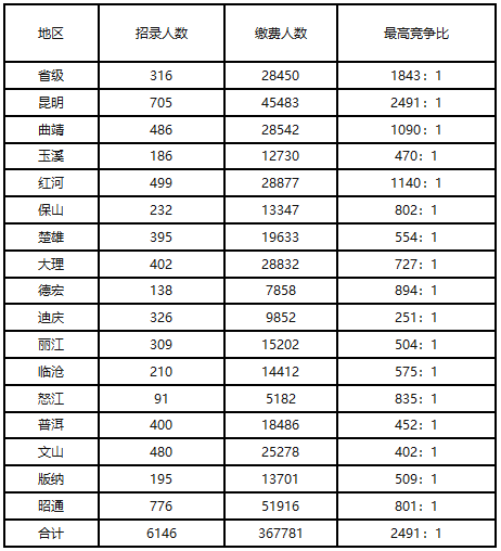 2021年云南省公務(wù)員考試共招錄6146人,設(shè)置4469個(gè)職位,報(bào)考人數(shù)為367781人,從這些數(shù)據(jù)我們可以知道省考競(jìng)爭(zhēng)十分激烈。在2021年省考招錄中,招錄人數(shù)最少的地市是怒江,共招錄91人,報(bào)名人數(shù)5182人,平均競(jìng)爭(zhēng)比達(dá)到57:1。招錄人數(shù)最多的地市是昭通,共招錄776人,報(bào)名人數(shù)51916人,平均競(jìng)爭(zhēng)比達(dá)到67:1。在全省的最高競(jìng)爭(zhēng)比中,昆明市的最高競(jìng)爭(zhēng)比高達(dá)2491:1,在全省各地市中名列第一??梢?jiàn),不管在哪個(gè)地市,省考崗位都是炙手可熱的,千萬(wàn)不能掉以輕心。