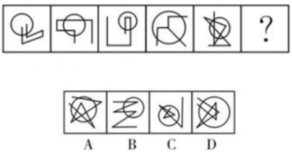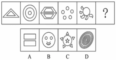 【答案】C【解析】觀察題干發(fā)現(xiàn)是順推型題干,依次觀察題干給出的五個(gè)圖形,好幾個(gè)圖形都有圓出現(xiàn)。那么圓,而且每個(gè)圖形內(nèi)部都是完成的封閉。我們可以首先考慮一下封閉區(qū)域數(shù)量。題干封閉區(qū)域數(shù)量依次是2、3、4、5、6所以我們應(yīng)該選擇一個(gè)七個(gè)封閉區(qū)域的,故本題選C。所以圓出現(xiàn)我們可以考慮封閉區(qū)域數(shù)量。