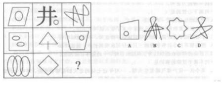 【答案】C【解析】觀察題干會(huì)發(fā)現(xiàn)每個(gè)圖形都有圓出現(xiàn),那么這里我們可以考慮一下圓內(nèi)圓外兩個(gè)世界,圓內(nèi)的交點(diǎn)數(shù),圓內(nèi)部的交點(diǎn)數(shù)依次是0、1、2、3、4,所以選一個(gè)圓內(nèi)部五個(gè)交點(diǎn)的,故本題選C。那么此題考的是元內(nèi)部的交點(diǎn)數(shù),偶爾也會(huì)考圓內(nèi)部的封閉區(qū)域數(shù)、部分?jǐn)?shù)、筆畫數(shù)等等。