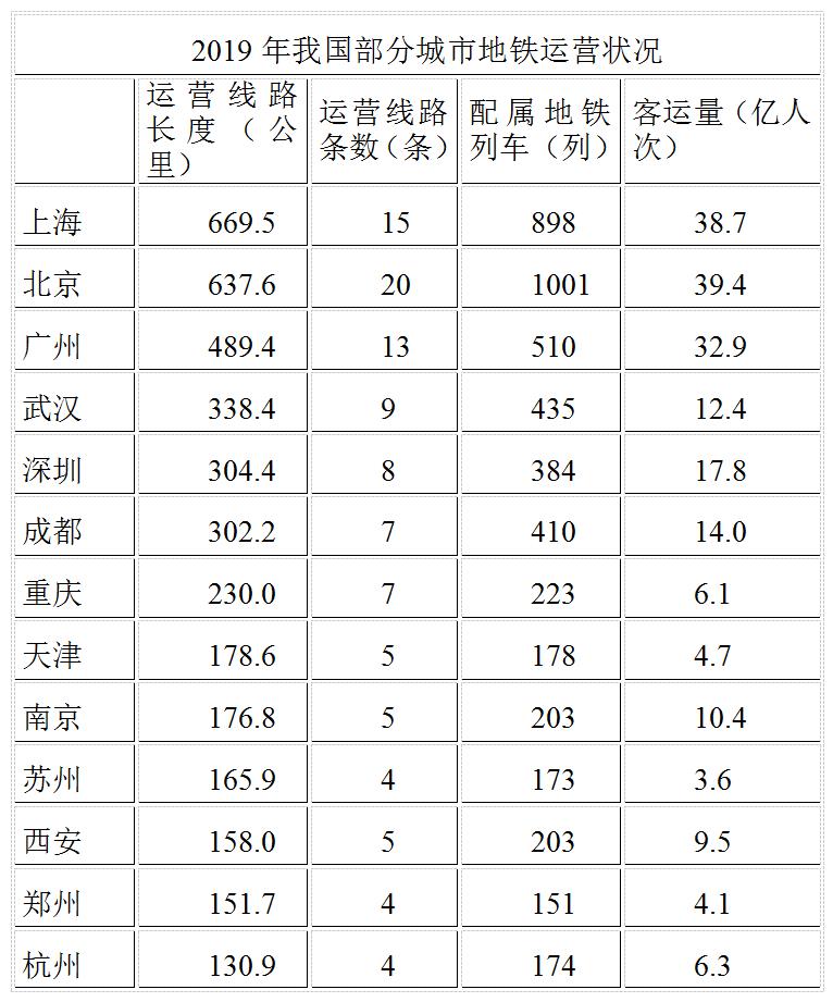 ?。?)以下城市中,2019年末平均每條運(yùn)營(yíng)的地鐵線路配屬地鐵列車(chē)數(shù)最多的是: