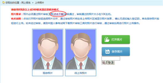 在考生登錄處進(jìn)行登錄,登錄成功后跳轉(zhuǎn)到上傳照片頁(yè)面,下載照片審核工具,如下圖所示: