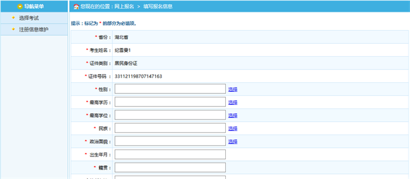 通過(guò)點(diǎn)擊接受按鈕,進(jìn)入考生填寫(xiě)報(bào)名信息的頁(yè)面,如下圖所示: