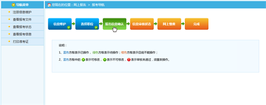 通過(guò)點(diǎn)擊“確認(rèn)”按鈕,提示確認(rèn)成功后跳轉(zhuǎn)到報(bào)考流程頁(yè)面。進(jìn)入審核狀態(tài),等待管理員進(jìn)行資格審核。