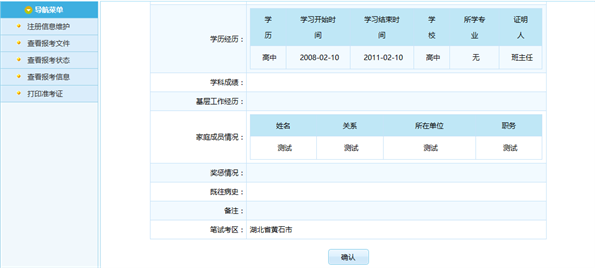 通過(guò)點(diǎn)擊“報(bào)名信息確認(rèn)”按鈕后,跳轉(zhuǎn)到報(bào)名信息確認(rèn)頁(yè)面,如下圖所示: