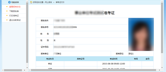 通過(guò)點(diǎn)擊系統(tǒng)導(dǎo)航菜單的“打印準(zhǔn)考證”選項(xiàng),可進(jìn)入準(zhǔn)考證打印頁(yè)面,如下圖所示: