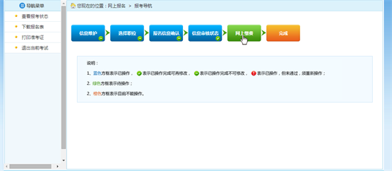 審核通過(guò)的考生可以進(jìn)行網(wǎng)上繳費(fèi),點(diǎn)擊報(bào)考流程中“網(wǎng)上繳費(fèi)”選項(xiàng),可以進(jìn)入網(wǎng)上繳費(fèi)的頁(yè)面,如下圖所示: