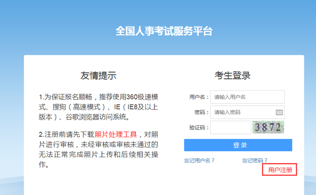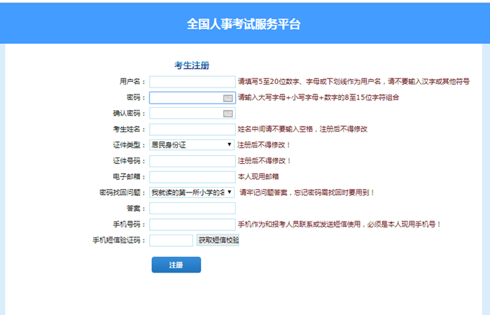3.如本人并未注冊(cè)但系統(tǒng)提示該證件號(hào)已注冊(cè)的,首先請(qǐng)確認(rèn)本人今年以來是否在全國人事考試服務(wù)平臺(tái)注冊(cè)過信息,如注冊(cè)過,請(qǐng)用原注冊(cè)賬號(hào)及密碼登陸(如忘記密碼,可以按系統(tǒng)提示找回密碼);如本人今年以來未在全國人事考試服務(wù)平臺(tái)注冊(cè)過信息,表明報(bào)考者的個(gè)人信息被他人盜用注冊(cè),請(qǐng)持本人身份證明材料(身份證或派出所開具的帶本人照片的臨時(shí)身份證)至各州(市)人力資源和社會(huì)保障局考試機(jī)構(gòu)核實(shí)處理。昆明市的核實(shí)處理地點(diǎn)為:云南省人事考試院(地址:昆明市人民中路170號(hào)云南人才市場三樓;郵編:650031;傳真:0871-63630225)。在此提醒各位報(bào)考者,注意個(gè)人信息保密,盡早注冊(cè)。