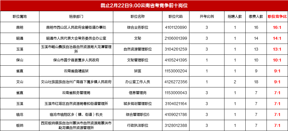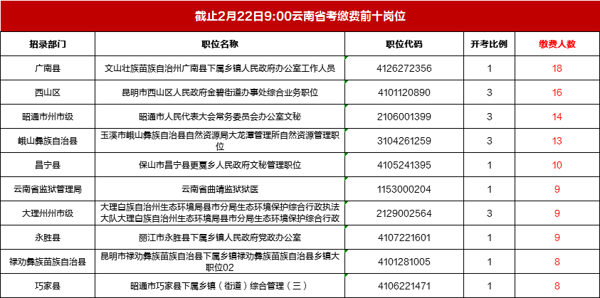 2022年云南公務(wù)員考試報(bào)名正在進(jìn)行中,截至2月22日9:00,累計(jì)報(bào)名繳費(fèi):1247人,報(bào)名最高競(jìng)爭(zhēng)比為16:1,無(wú)人報(bào)名繳費(fèi)的崗位有:2066個(gè)。