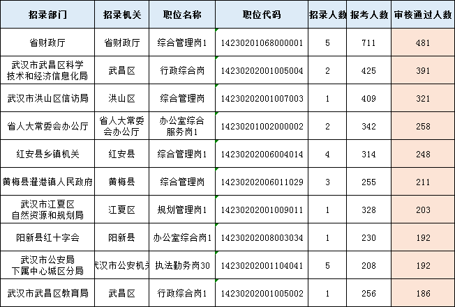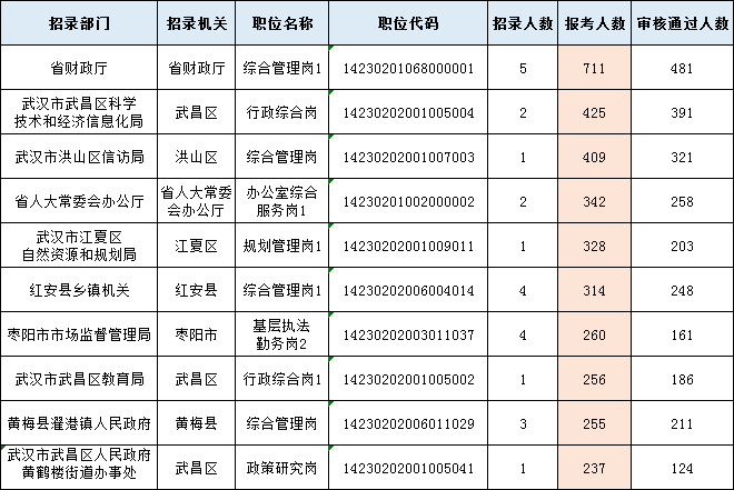 截至2月23日,2022年湖北公務員考試報名第五天,已有111441人報名,76329人通過審核,報名人數(shù)最多的職位是(省財政廳-綜合管理崗1-14230201068000001)一職,該崗位招錄5人,已有711人報名,481人通過審核。截至2月23日,共有170個崗位無人報考。具體可下載附件查看: