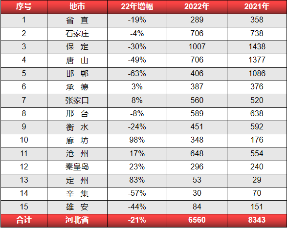 2022 年河北省公務(wù)員招錄6560人,與2021年8343人相比,同比降低21%。其中,招錄人數(shù)超1000人的地市由去年的三個(gè)減為僅有保定一個(gè)。與2021年相比,降幅較大的城市有邯鄲、唐山、保定、辛集,降幅分別是63%、49%、30%、57%。而廊坊、定州等也有較大增幅,98%及83%。