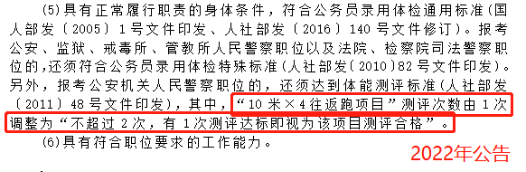 報(bào)考公安機(jī)關(guān)人民警察職位的考生,面試前需參加體能測(cè)評(píng)且成績(jī)合格。體能測(cè)評(píng)工作由各市(含定州、辛集市)、雄安新區(qū)公務(wù)員主管部門會(huì)同當(dāng)?shù)毓矙C(jī)關(guān)組織實(shí)施。體能測(cè)評(píng)按照《關(guān)于印發(fā)<公安機(jī)關(guān)錄用人民警察體能測(cè)評(píng)項(xiàng)目和標(biāo)準(zhǔn)(暫行)>的通知》執(zhí)行,其中10米×4往返跑項(xiàng)目測(cè)評(píng)次數(shù)調(diào)整為不超過(guò)2次。