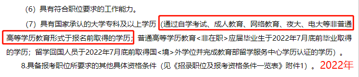 具有國(guó)家承認(rèn)的大學(xué)??萍耙陨蠈W(xué)歷(通過(guò)自學(xué)考試、成人教育、網(wǎng)絡(luò)教育、夜大、電大等非普通高等學(xué)歷教育形式于報(bào)名前取得的學(xué)歷;普通高等學(xué)歷教育<非在職>應(yīng)屆畢業(yè)生于2022年7月底前畢業(yè)取得的學(xué)歷;留學(xué)回國(guó)人員于2022年7月底前取得國(guó)<境>外學(xué)位并完成教育部留學(xué)服務(wù)中心學(xué)歷認(rèn)證的學(xué)歷)。