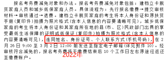 在2022年的公告中,對(duì)于減免考務(wù)費(fèi)的考生來(lái)說(shuō),提交審核材料到電子郵箱時(shí),除了需要把相關(guān)證件拍攝成照片,還需要在郵件正文寫上姓名、身份證號(hào)、個(gè)人聯(lián)系方式這3項(xiàng)信息。