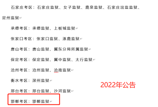 在2022年的公告中,司法廳系統(tǒng)考區(qū)變化,從過(guò)去的8個(gè)變成了9個(gè),新增邯鄲考區(qū)(邯鄲監(jiān)獄)。