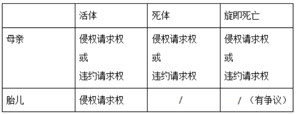 觀察此表格可知,針對(duì)胎兒的侵權(quán)依舊依照胎兒是否存活分為三種情況:1.胎兒分娩后為活體。此時(shí)母親可以以自己的名義提起侵權(quán)或違約之訴,同時(shí)胎兒也有自己獨(dú)立的訴求,可以向醫(yī)院主張侵權(quán),只不過該權(quán)利應(yīng)該由監(jiān)護(hù)人代為行使。2.胎兒分娩后為死體。該種情況胎兒無獨(dú)立的請(qǐng)求權(quán),僅母親以自己的名義主張侵權(quán)或違約。3.胎兒分娩出時(shí)為活體,很快死亡。此類情況在實(shí)踐中仍舊存在爭(zhēng)議,對(duì)于胎兒死亡后,留下的債權(quán)請(qǐng)求權(quán)是否可以被母親繼承現(xiàn)在法律仍沒有給出明確的答案,此問題不在考察的范圍內(nèi)。