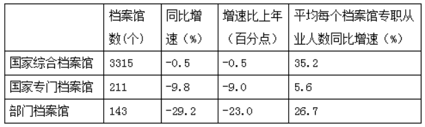 【答案】A【解析】這道題讓我們求國家綜合檔案館專職從業(yè)人員數(shù)比上年的增長率,由專職從業(yè)人員數(shù)=檔案館數(shù)×平均每個檔案館專職從業(yè)人數(shù)可知,這道題讓我們求的是兩數(shù)乘積的增長率,由表可知國家綜合檔案館數(shù)的增長率為-0.5%(