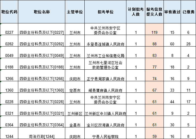 截止2月26日17時,2022年甘肅公務(wù)員考試共有6278人提交報名,2246人通過審核,753人繳費(fèi),650個崗位無人報考,具體數(shù)據(jù)詳見附件: