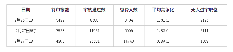 本次河北省考提供4639個(gè)職位,招錄6560人。截至2月27日18時(shí),報(bào)名總?cè)藬?shù)為29704人。