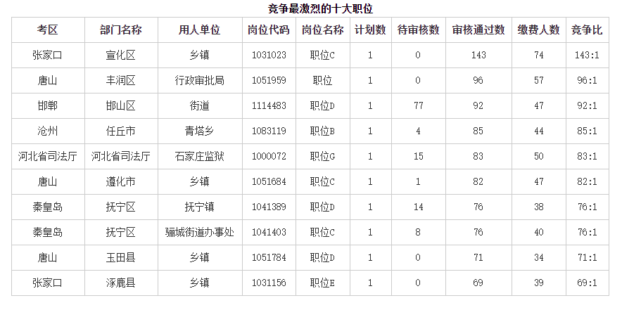 截止到27日18時(shí),競(jìng)爭(zhēng)比例最高的職位為張家口宣化區(qū)鄉(xiāng)鎮(zhèn)職位C,職位代碼:1031023 ,招錄1人,審核通過(guò)人數(shù)為143人,競(jìng)爭(zhēng)比143:1 !