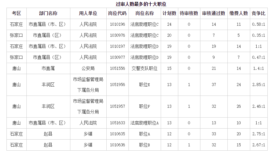 截止到27日18時(shí),招考人數(shù)最多的十大職位主要集中在石家莊、張家口、唐山地區(qū),具體信息如下:石家莊市直屬縣(市、區(qū))人民法院法官助理職位C,招錄24人,過(guò)審人數(shù)是14人,競(jìng)爭(zhēng)比:0.58:1。