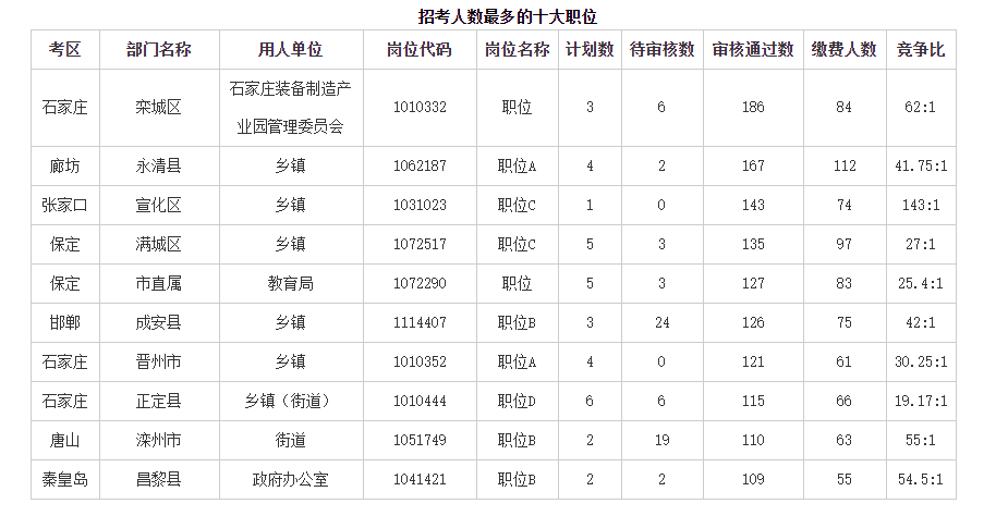 截止到27日18時(shí),報(bào)名通過(guò)審核人數(shù)前十的職位主要集中在石家莊、廊坊、張家口,具體信息如下:石家莊欒城區(qū)石家莊裝備制造產(chǎn)業(yè)園管理委員會(huì)職位,招錄3人,過(guò)審人數(shù)是186人。