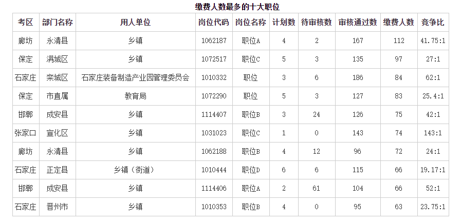 截止到27日18時(shí),繳費(fèi)人數(shù)最多的十大職位主要集中在廊坊、保定、石家莊地區(qū),具體信息如下:廊坊永清縣鄉(xiāng)鎮(zhèn)職位A,招錄4人,過(guò)審人數(shù)是167人,繳費(fèi)人數(shù)112人。