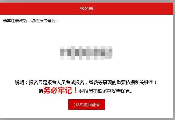 點(diǎn)擊注冊(cè)后會(huì)看到考生的報(bào)名號(hào),報(bào)名號(hào)是系統(tǒng)登錄必須信息,無論是報(bào)名、繳費(fèi)、打印準(zhǔn)考證、成績查詢等都需要登錄報(bào)考系統(tǒng),因此考生務(wù)必保存好自己的報(bào)名號(hào),如報(bào)名號(hào)丟失可在登錄界面點(diǎn)擊找回報(bào)名號(hào)進(jìn)行找回。