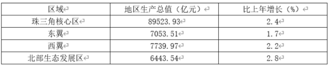 注:數(shù)據(jù)來源于《廣東省2020年國民經(jīng)濟(jì)和社會發(fā)展統(tǒng)計(jì)公報(bào)》;珠三角核心區(qū)域廣州、深圳、珠海、佛山、惠州、東莞、中山、江門和肇慶,東翼指汕頭、汕尾、潮州和揭陽,西翼指陽江、湛江和茂名,北部生態(tài)發(fā)展區(qū)指韶關(guān)、河源、梅州、清遠(yuǎn)和云浮。