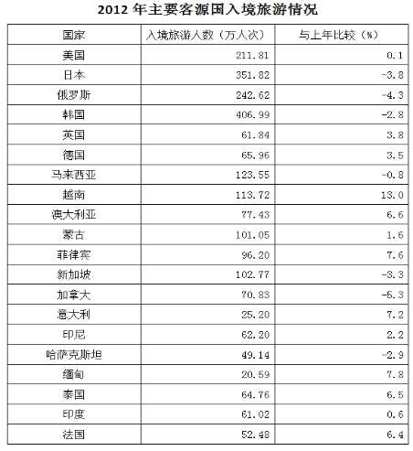 2012年,全國國內(nèi)旅游人數(shù)29.57億人次,比上年增長12.0%。其中,城鎮(zhèn)居民19.33億人次。2012年,全國國內(nèi)旅游收入22706.22億元人民幣,比上年增長17.6%。2012年,全年入境外國游客人數(shù)比上年增長0.3%,其中,亞洲市場入境人數(shù)1664.88萬人次,與上年基本持平,占入境外國游客人數(shù)61.2%;歐洲市場入境人數(shù)592.16萬人次,增長0.2%;美洲市場入境人數(shù)317.95萬人次,減少0.7%;大洋洲市場入境人數(shù)91.49萬人次,增長6.5%;非洲市場入境人數(shù)52.49萬人次,增長7.4%。