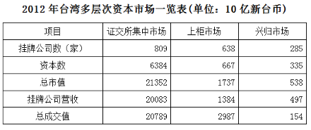臺灣資本市場第三層次為興柜市場。在準入門檻方面,興柜市場沒有營業(yè)利潤、資本額、設(shè)立年限的限制,只須符合已經(jīng)申報上市或上柜輔導且兩家以上證券商書面推薦。至2012年底,興柜公司285家,資本額0.335兆新臺幣,總市值0.538新臺幣。