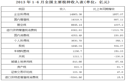 ④2013年我國上半年企業(yè)所得稅、國內(nèi)增值稅兩項之和不到同期稅收總收入的50%