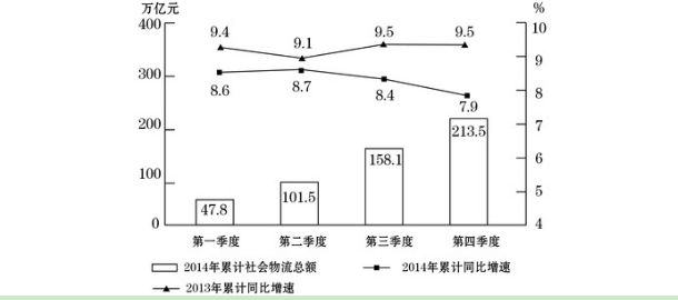2014年全國社會物流總額213.5萬億元,同比增長7.9%,比上年回落1.6個百分點(diǎn)。